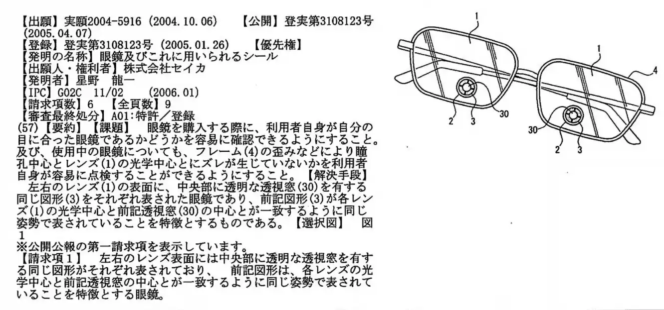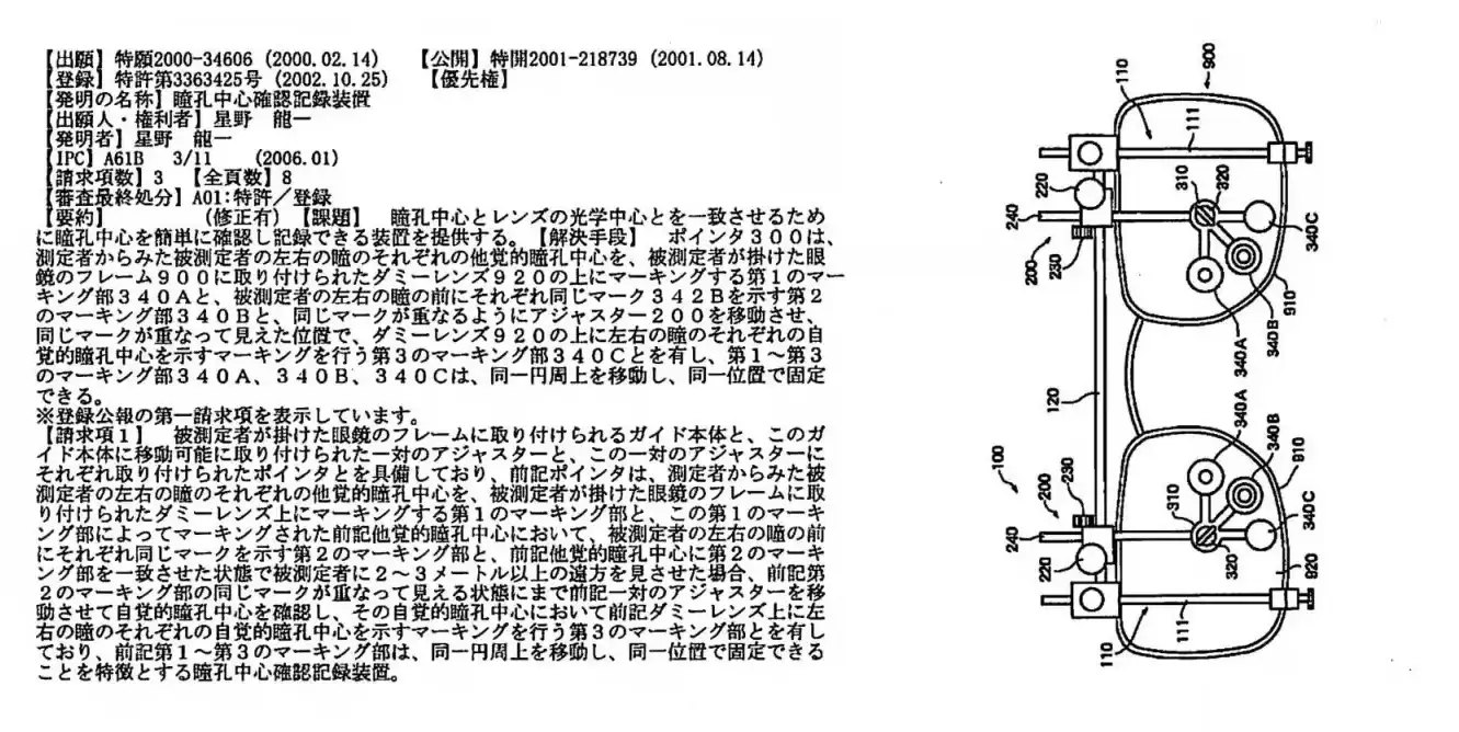 「瞳孔中心確認記録装置」は、瞳孔とレンズの光学中心を一致させ、快適な眼鏡を作成するための装置です。2002年(平成14年)に日本で特許を取得後、米国・中国・インド・韓国・インドネシアなどでも各種権利を取得しました。